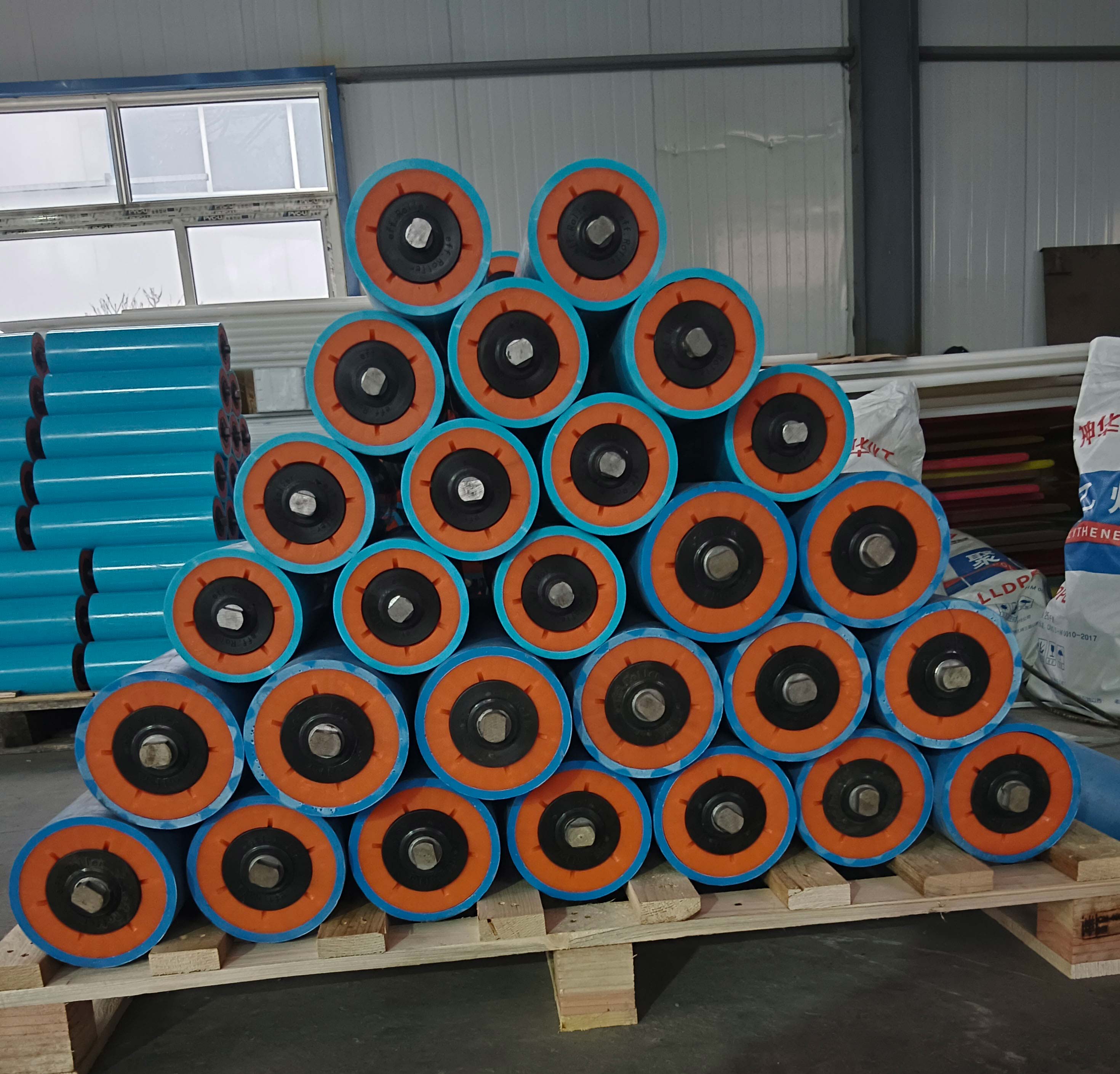 3、超高分子量聚乙烯托輥,由于材料自身的抗粘附性,即使在有水或油媒介下,轉動部位也不會因粉塵滯垢而影響其運作。